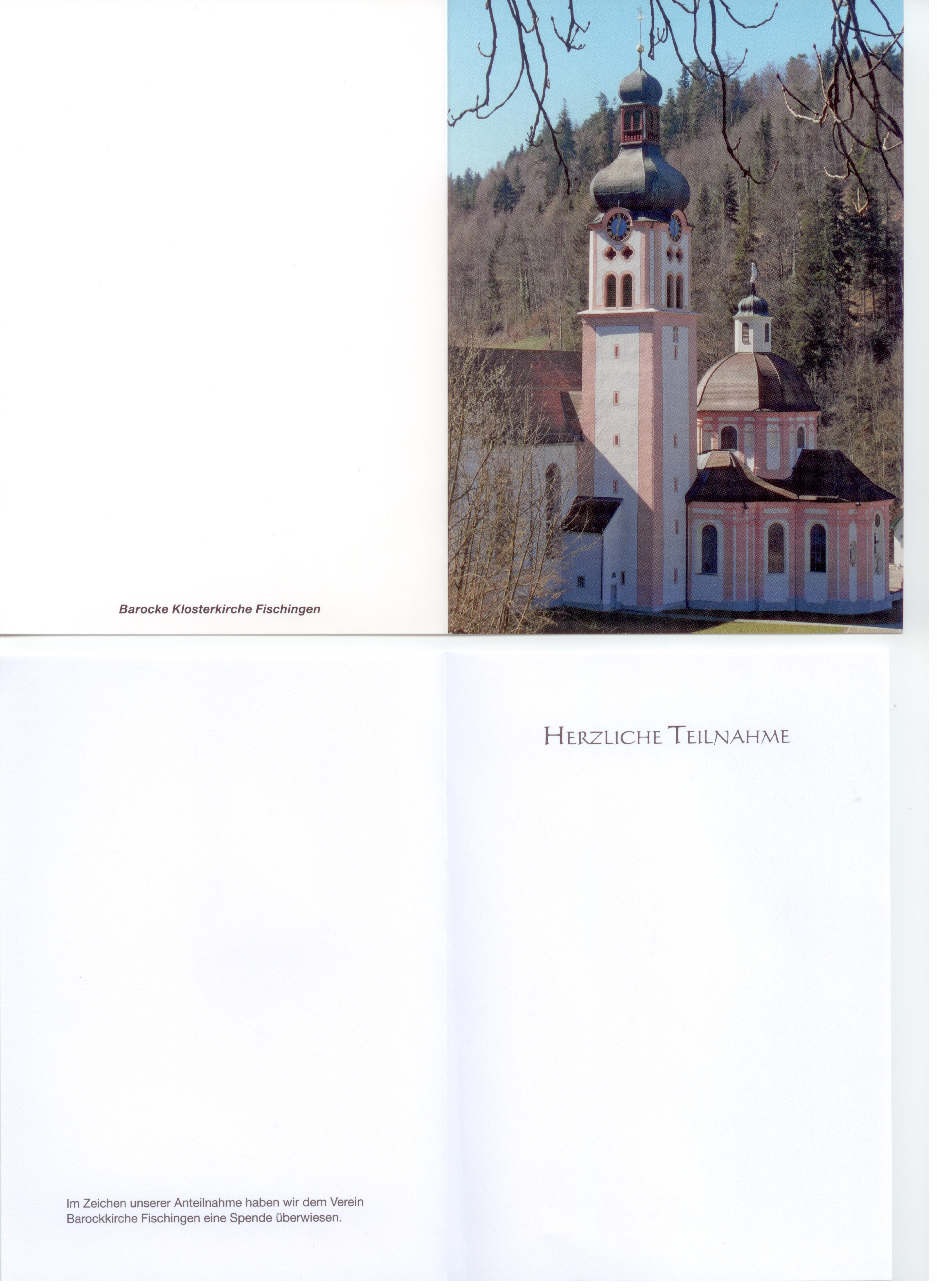- Verweisen Sie die in der Todesanzeige auf uns z.B. mit: «Anstelle von Blumen gedenke man dem Verein Barockkirche Fischingen. Konto IBAN: CH05 8080 8006 4783 8877 5». Teilen Sie uns bitte mit, dass Sie zu Spenden für uns aufgerufen haben, damit wir Sie dann beim Eingang benachrichtigen können (kassier@barockkirche-fischingen.ch).